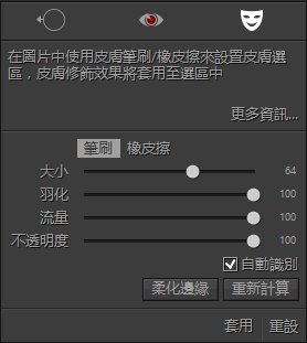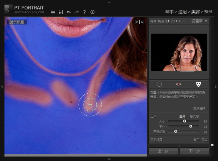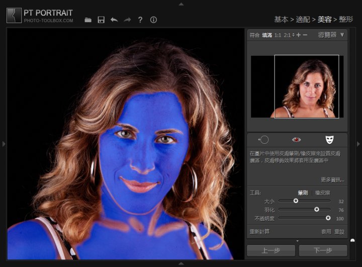 重新计算 – 根据在“适配”步骤设定的面部轮廓线重新计算皮肤选区。点击重新计算按钮也将移除之前在皮肤选区上进行的所有操作。